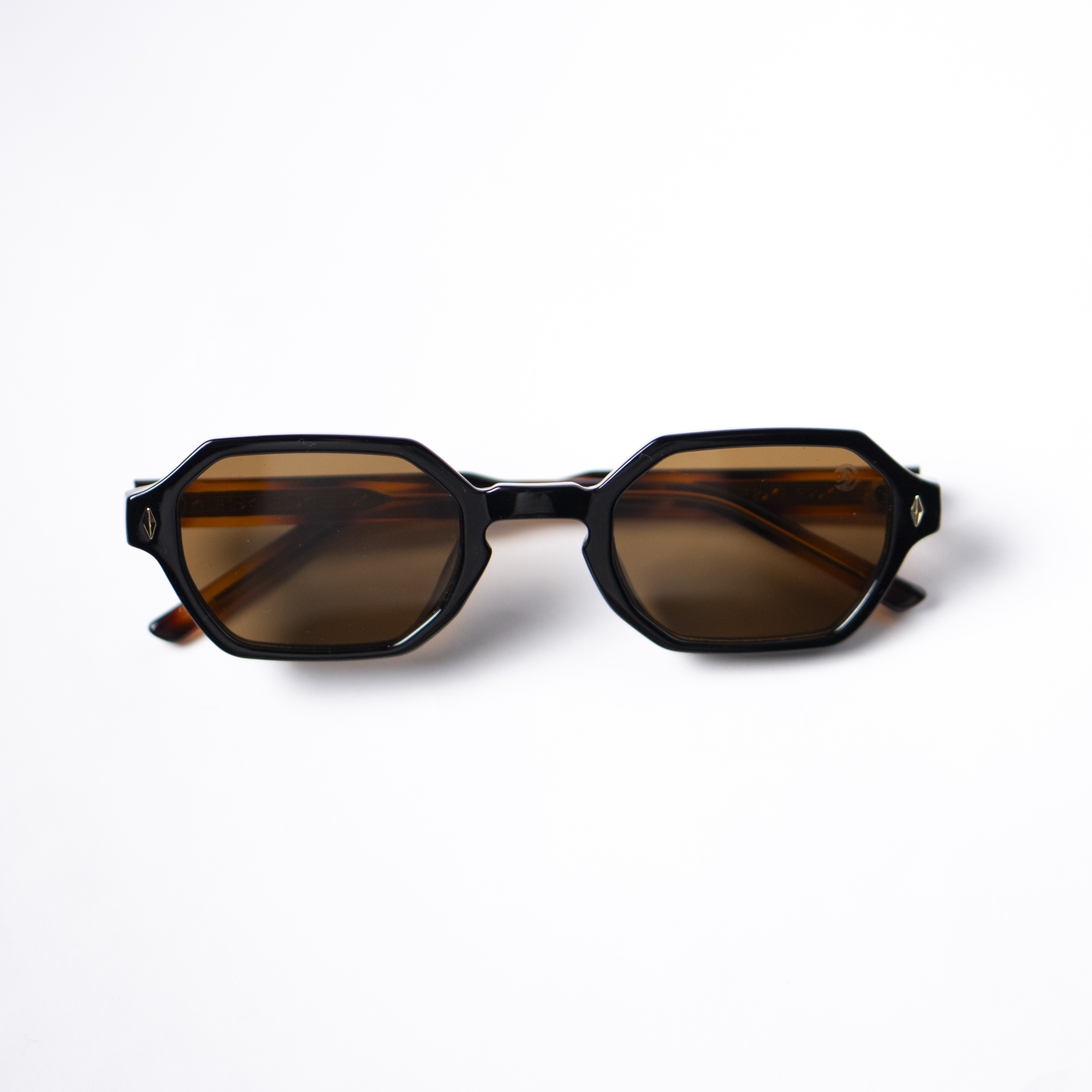 Óculos de sol com estrutura em acetato italiano preto, hastes animal print e lentes marrons com proteção UV400. A