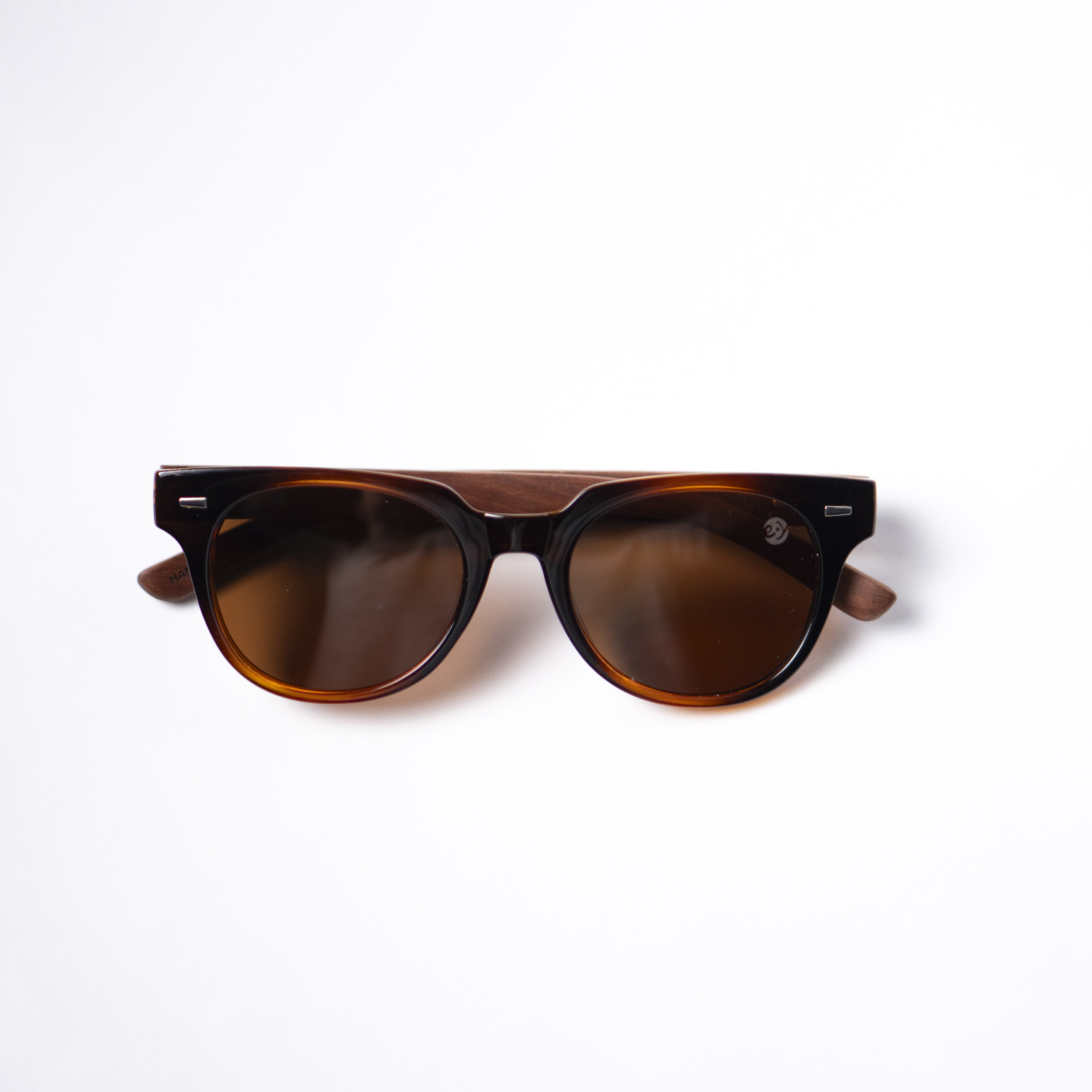 Óculos de sol com estrutura em acetato italiano tartaruga, hastes em bambu natural e lentes marrons com proteção UV400. Acompanha case e flanela de limpeza.