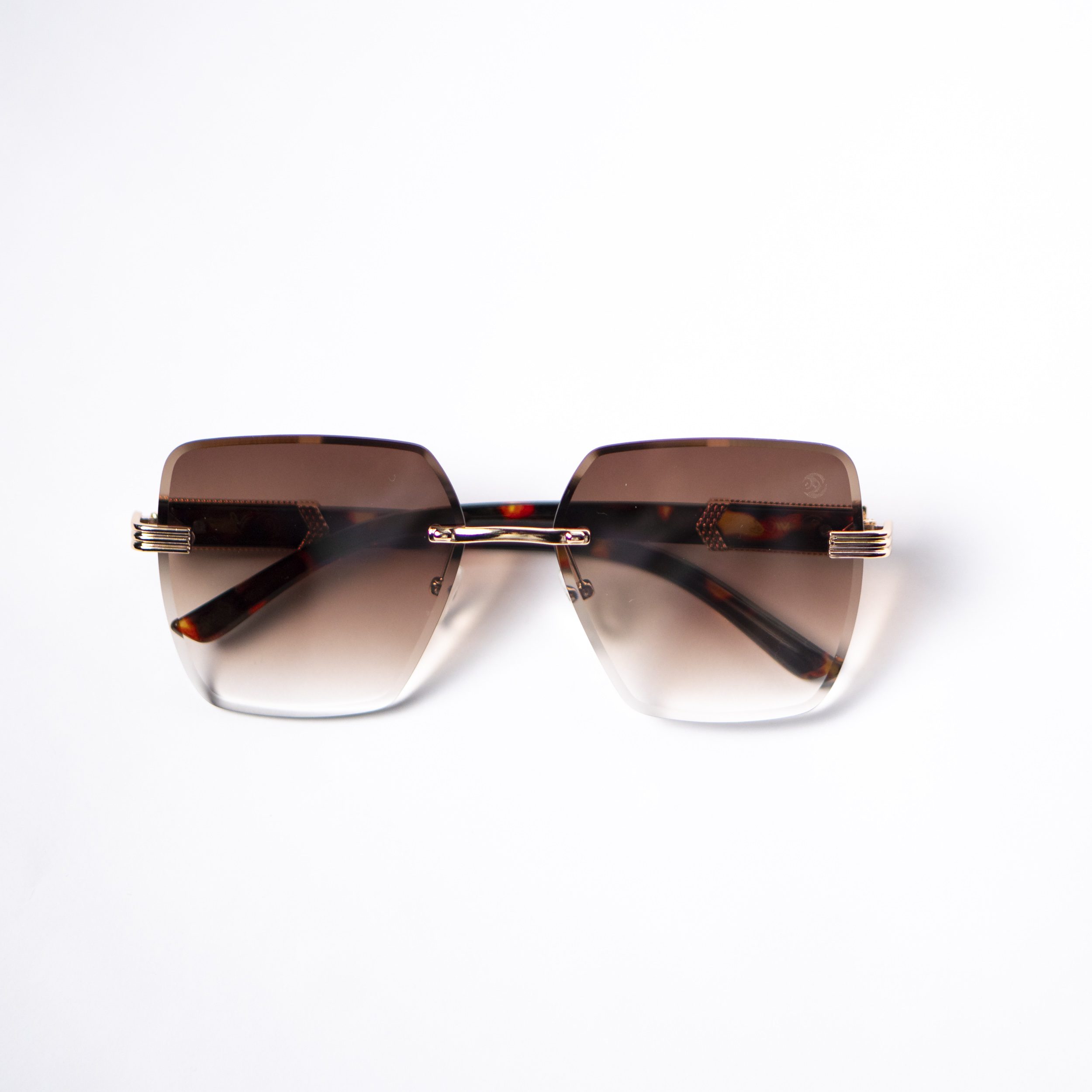 Óculos de sol com estrutura em metal dourdo e lentes caramelo degradê com proteção UV400. Acompanha case e flanela de limpeza.