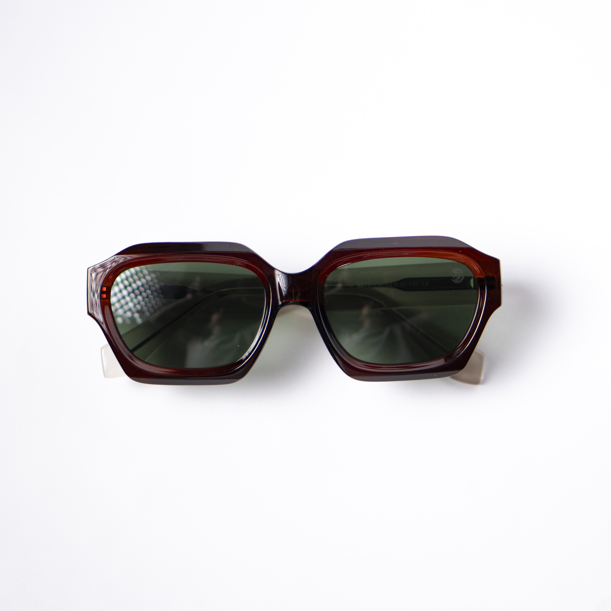 Óculos de sol com estrutura em acetato italiano marrom com haste transparente e metálica, com lentes verdes com proteção UV400. A