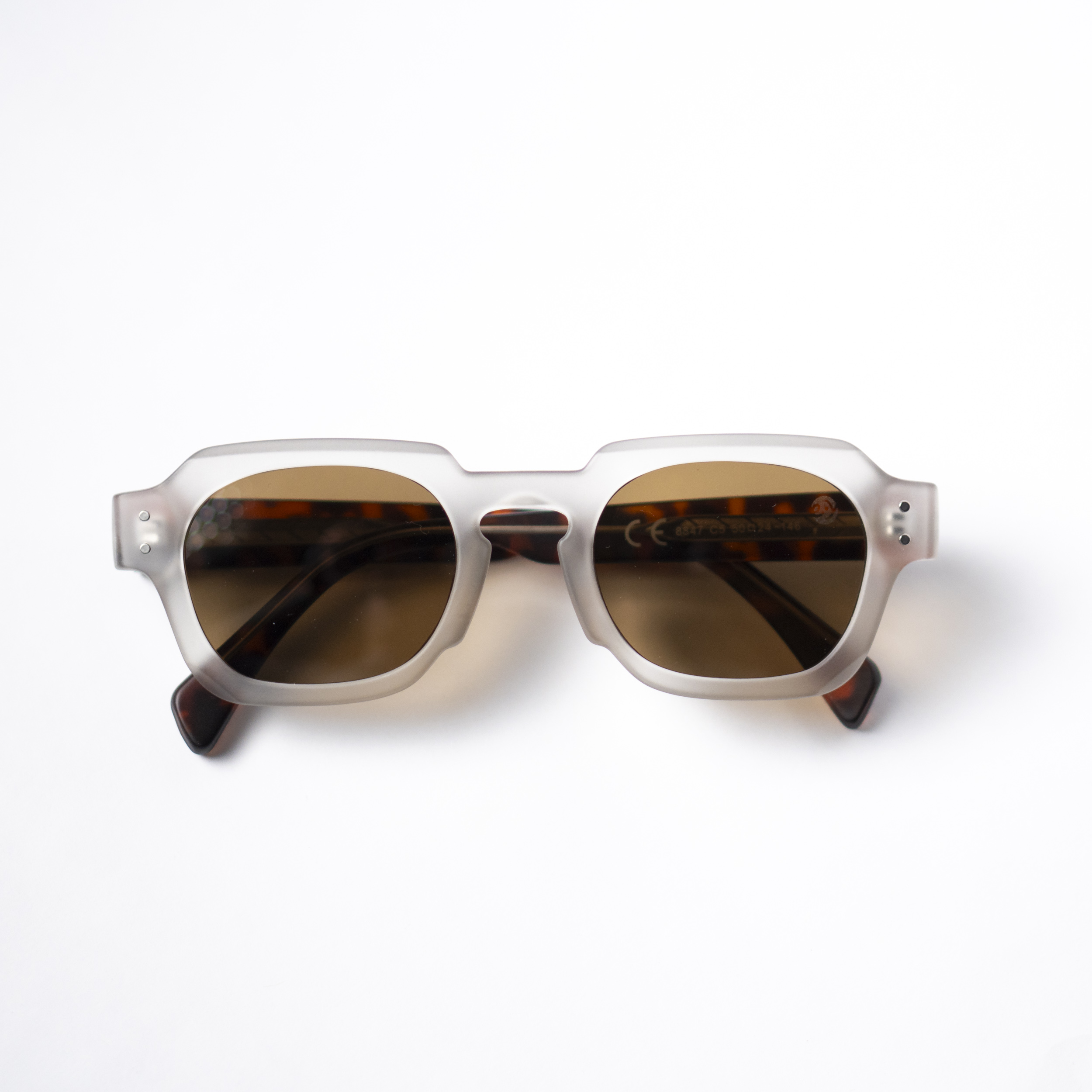 Óculos de sol com estrutura em acetato italiano transparente fosco, hastes tartaruga e lentes marrons com proteção UV400.
