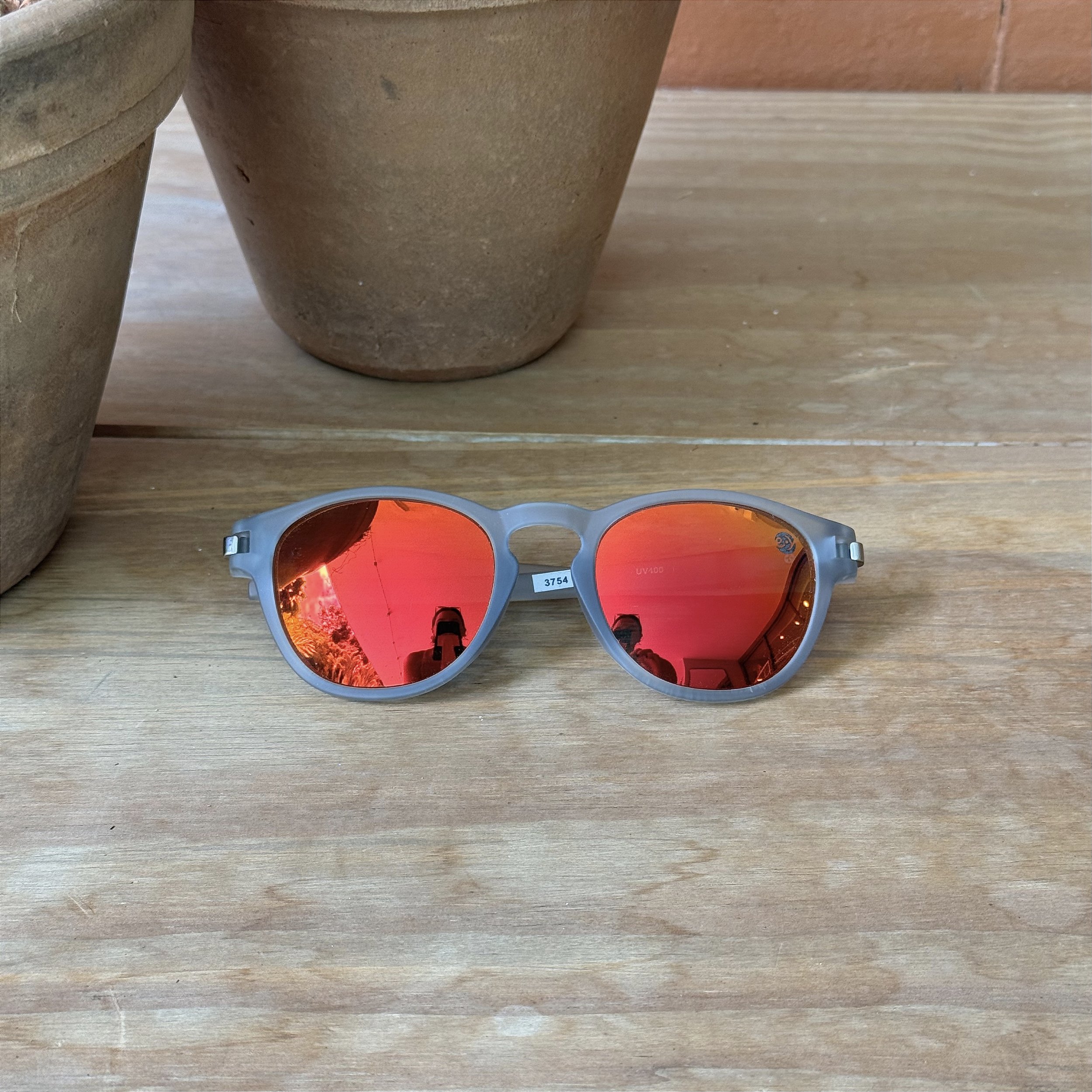 Óculos de sol com estrutura em acetato italiano cinza e lentes vermlhas polarizadas UV400.