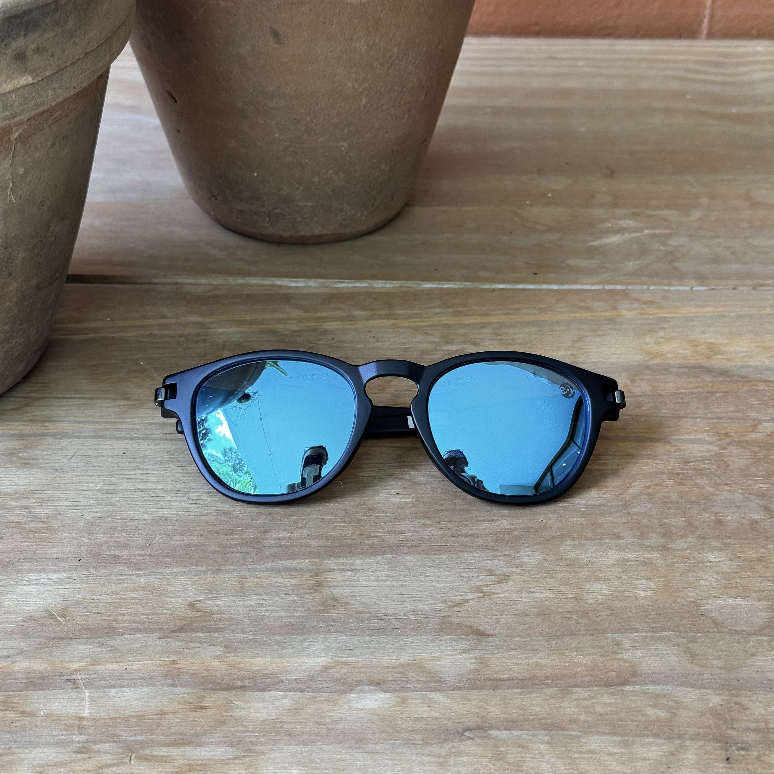 Óculos de sol com estrutura em acetato italiano preto e lentes azuis polarizadas UV400.