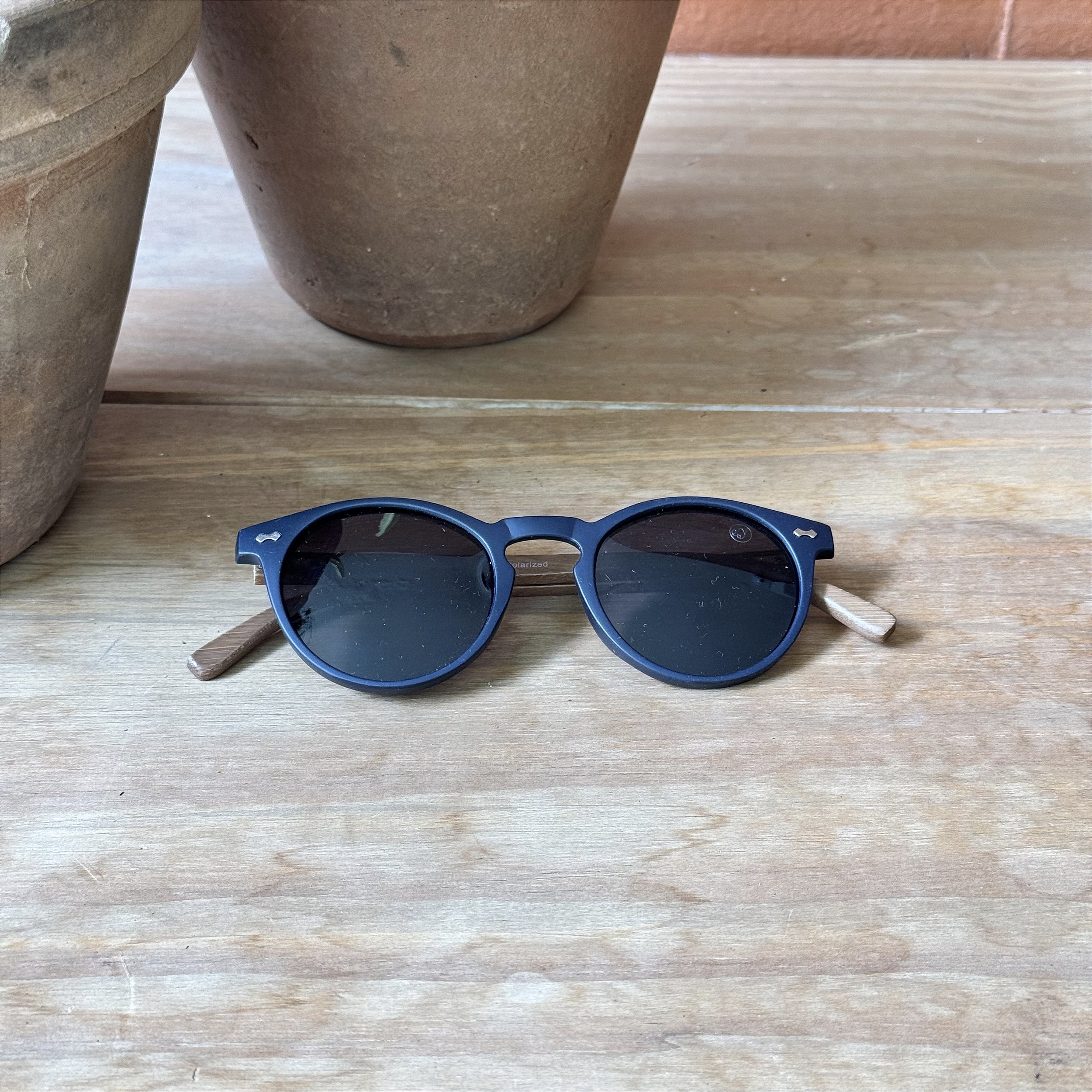 Óculos de sol com estrutura em acetato italiano preto, hastes em bambu natural e lentes pretas polarizadas UV400.