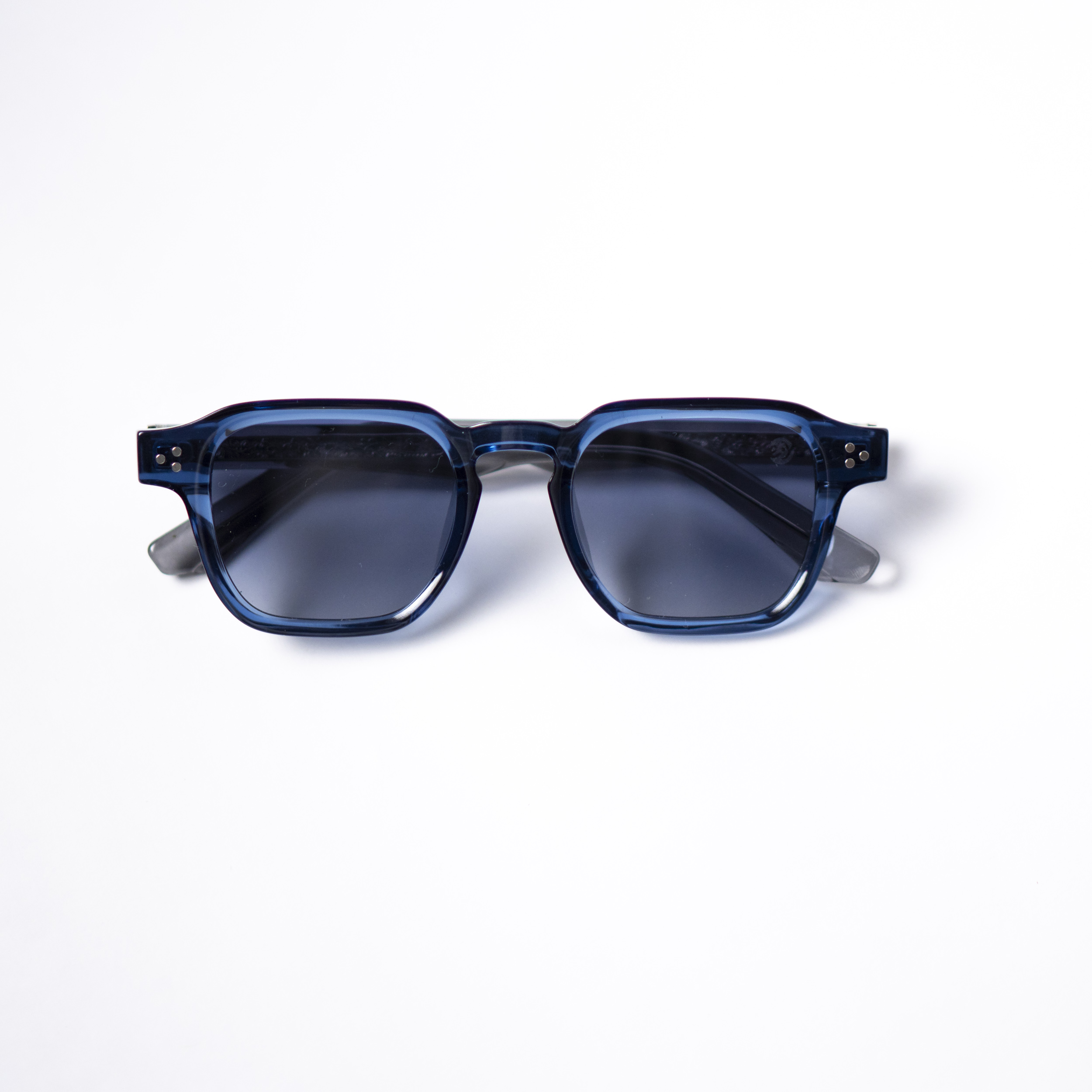 Óculos de sol com estrutura em acetato italiano azul transparente, com lentes azuis degrade com proteção UV400. A