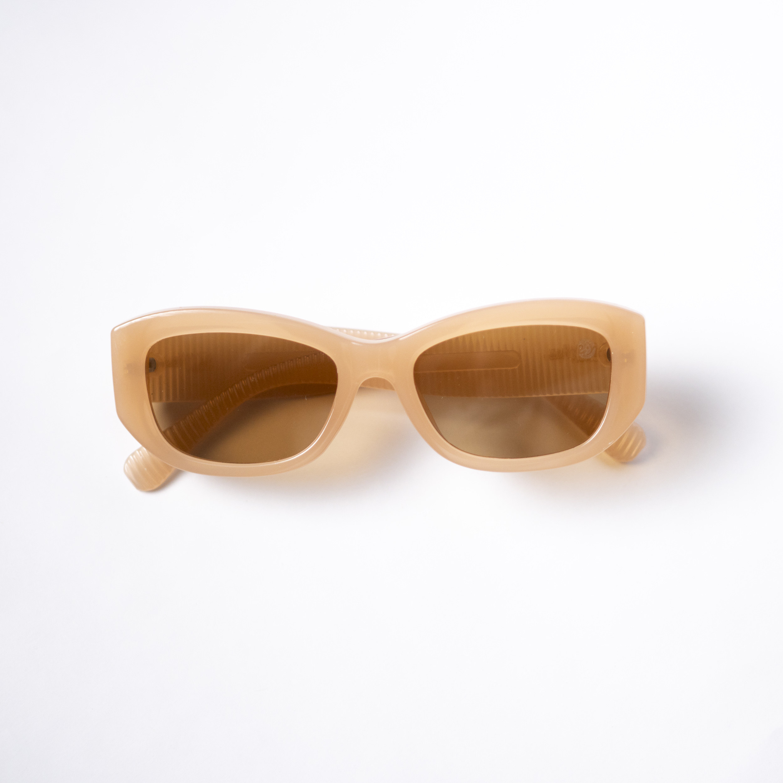 Óculos de sol com estrutura em acetato italiano rosê e lentes marrons com proteção UV400.