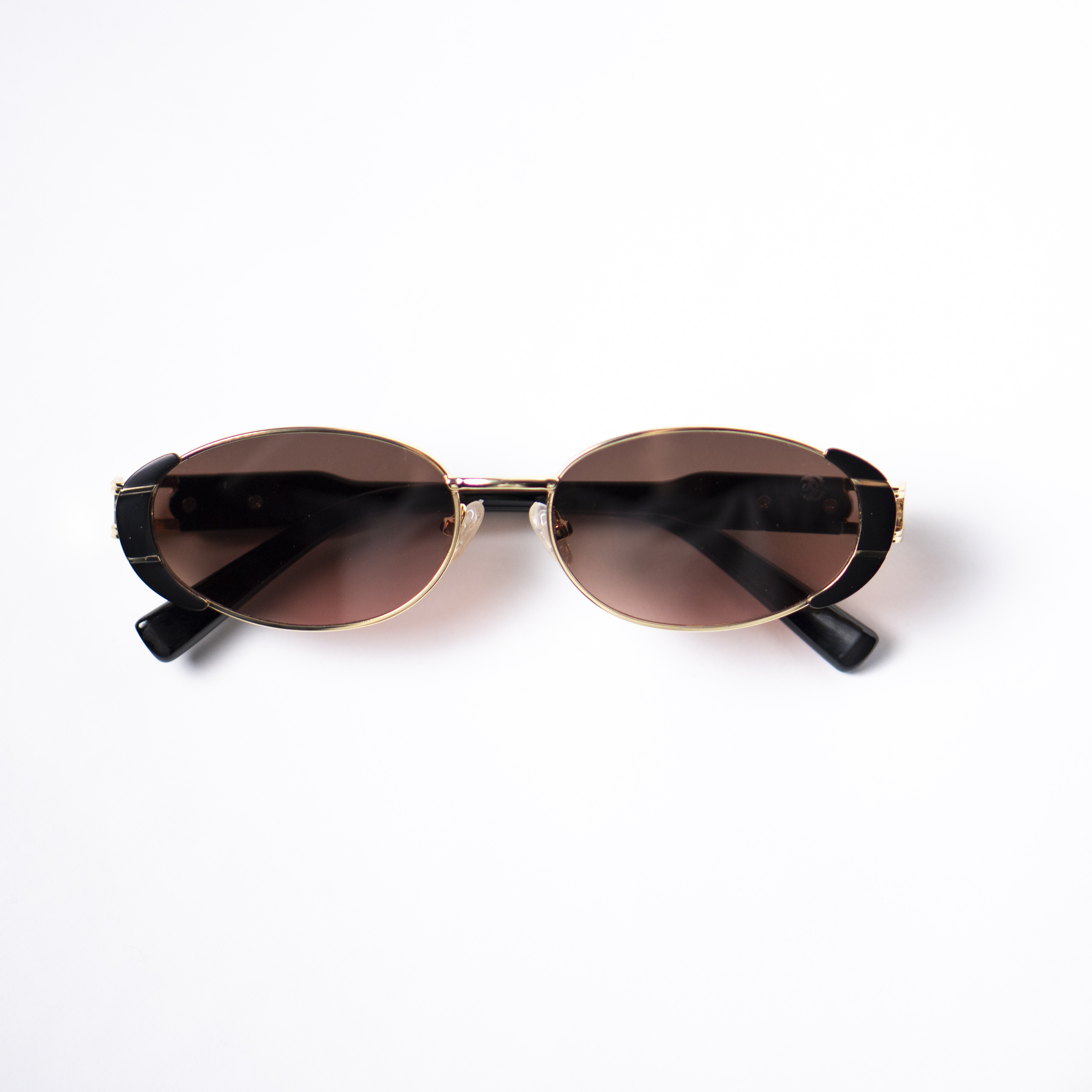 Óculos de sol com estrutura em metal dourdo, acabamento em acetato italiano preto e lentes marrons com proteção UV400. Acompanha case e flanela de limpeza.