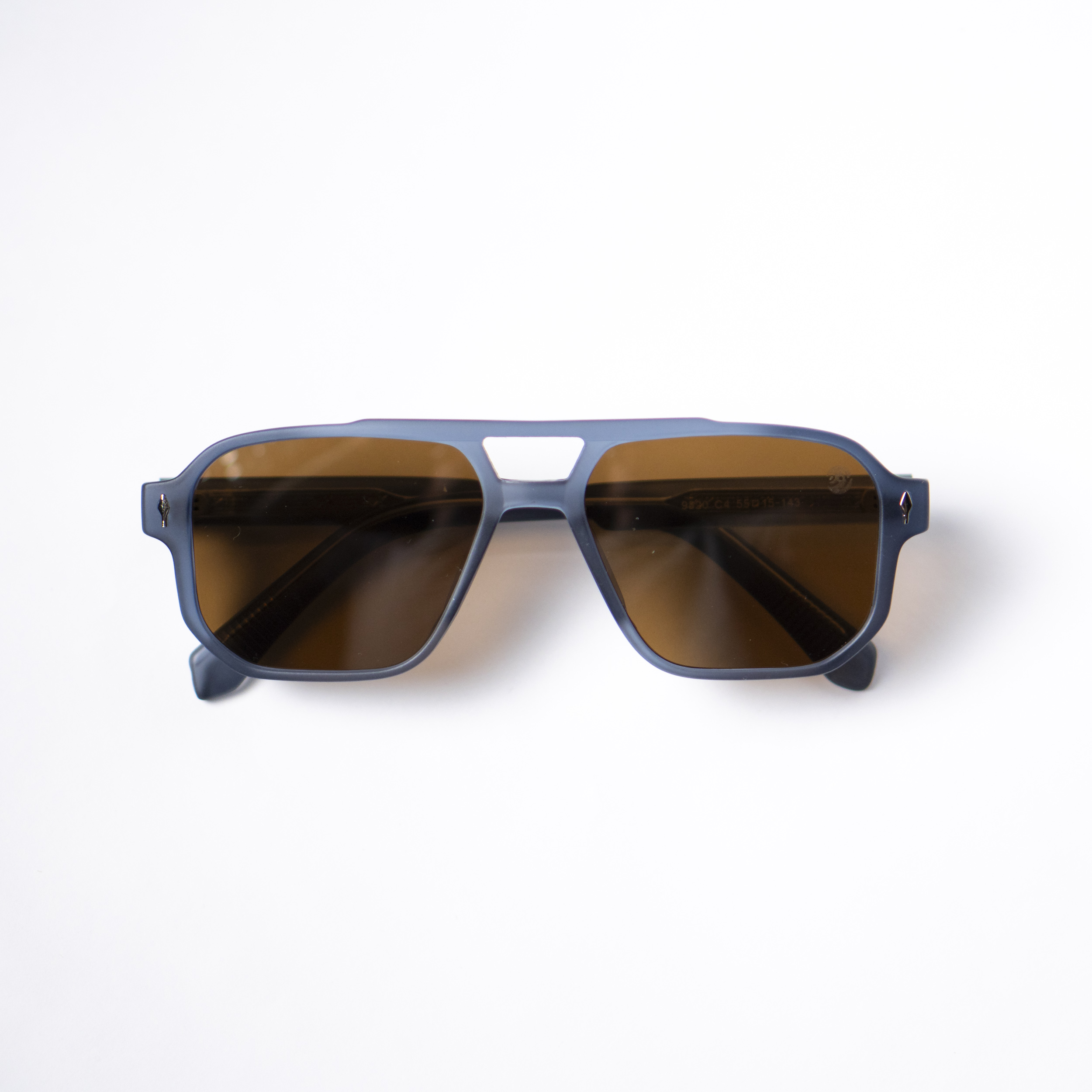 Óculos de sol com estrutura em acetato italiano azul fosco e lentes marrons com proteção UV400.
